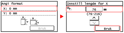 2 | Trykk på [X] eller [Y] for å angi lengde, og trykk på [Bruk]. ![]() Hvis ofte brukte ikke-standard papirformater er registrert, vises det lagrede formatet som papirformatet. Registrere papir med annet format enn standard (egendefinert format) |