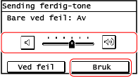 For å kun spille av en fullføringslyd når det oppstår en feil, trykker du på [Ved feil] og angir til [På].