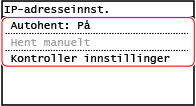2 | Konfigurer innstillingen for automatisk innhenting etter behov. [Velg protokoll] Vanligvis stilt inn til [DHCP]. Når [DHCP] imidlertid er stilt inn i et miljø der DHCP ikke kan brukes, vil maskinen fortsette å bekrefte automatisk innhenting i nettverket, noe som fører til unødvendig kommunikasjon. Når du ikke bruker DHCP, stiller du denne inn til [Av]. [Auto-IP] Vanligvis stilt inn til [På]. Selv om prioritet gis til IP-adresser som er tildelt med DHCP, vil automatisk IP bli brukt hvis det ikke kommer respons fra DHCP. |