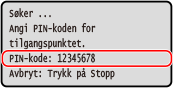 Når trådløst LAN-ruteren støtter WPS PIN-kodemodus, kan du opprette en forbindelse ved å registrere en PIN-kode som genereres på maskinen til trådløst LAN-ruteren. Bruk en datamaskin når du vil registrere PIN-koden.