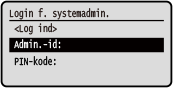 Hvis systemadministratorens id er indstillet, vises login-skærmen for handlinger, der kræver administratorrettigheder. Indtast systemadministratorens id og PIN-koden for at logge på.