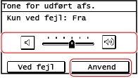 Hvis der kun skal komme en lyd ved færdiggørelse, hvis der opstår en fejl, skal du trykke på [Ved fejl] og indstille til [Til].