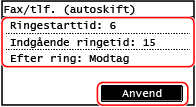 Indstil ringetiden og handlingen ved modtagelse af en fax, og tryk på [Anvend].