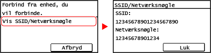 1 | Tryk på [Vis SSID/Netværksnøgle] for at kontrollere maskinens SSID og netværksnøgle. |