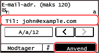 | | Du kan scanne en original og sende de scannede data via e-mail som vedhæftet fil. Som når du sender en almindelig e-mail, kan du tilføje emne, skrive en besked og angive flere destinationer. |