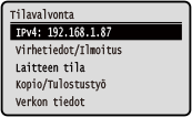 painetaan. Näkymässä voit tarkistaa laitteen tiedot, käytön ja lokit, verkkoasetukset ja virheen tiedot. [Tilavalvonta]-näyttöKosketuspaneelimalli ![]() | 5 rivin LCD-malli ![]() |
