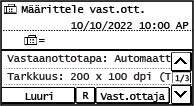 Usein käytettyjen skannausasetusten tallentaminen oletusasetuksiksiVoit muuttaa faksin alkuperäisten asiakirjojen skannauksen oletusasetuksia usein käytettyjen skannausasetuksien mukaisiksi. Oletusasetusten muuttaminen Aiempien asetusten palauttaminen (lähetystyöloki)Voit käyttää lähetystyölokia faksien lähettämiseen aiemmin käytettyjen asetusten palauttamiseen. Kohteiden määrittäminen (lähetystyöloki) |