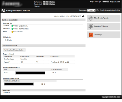 Kun kirjaudut etäkäyttöliittymään, portaalisivu (etäkäyttöliittymän aloitussivu) tulee esiin. Sivulla voit tarkistaa laitteen toimintatilan, tarkastella erilaisia tietoja ja muuttaa asetuksia painikkeita käyttämällä.