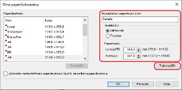 Syötä mukautetun paperikoon nimi ja paperin nimi ja napsauta [Tallenna].