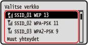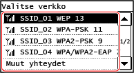 Hae langattoman lähiverkon reititin (tukiasema), johon muodostetaan yhteys, ja syötä verkkoavain. Jos yhteys muodostetaan käyttämällä tukiaseman asennusmenetelmää, seuraavat todennus- ja salausmenetelmät asetetaan: WEP-todentamismenetelmä: Avoin järjestelmä WPA/WPA2-salaus: AES-CCMP tai TKIP asetetaan automaattisesti valitun langattoman lähiverkon reitittimen mukaan. Jos haluat määrittää eri todennus- tai salausmenetelmän, käytä manuaalista asennusmenetelmää. Yhdistäminen langattomaan lähiverkkoon asettamalla tiedot (manuaalinen asennusmenetelmä) |