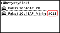 Jos tulostusta ei voi suorittaa tai skannattua dataa tai faksia ei voi lähettää tai vastaanottaa tai tapahtuu muu virhe, raportissa tai työlokissa näytetään virhekoodi (kolminumeroinen luku, jonka alussa on "#").