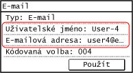 Pro zadání informací o místu určení stiskněte tlačítko [E-mailová adresa] nebo [Faxové číslo], zadejte informace a poté stiskněte [Použít].