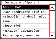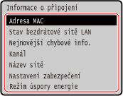 Když je zařízení připojeno k bezdrátové síti LAN, můžete kromě MAC adresy a informací o připojení k bezdrátové síti LAN také zobrazit nastavení zabezpečení.