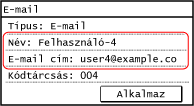 A célhely adatainak megadásához nyomja meg az [E-mail cím] vagy a [Faxszám] lehetőséget, adja meg az adatokat, majd nyomja meg az [Alkalmaz] gombot.