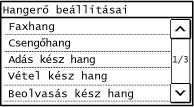 Az alábbi értesítési hangjelzések hangereje módosítható: Fax küldése, fax fogadása, faxküldés befejezése, faxfogadás befejezése, illetve az eredeti faxdokumentumok beolvasásának befejezése.