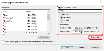 Adja meg az egyedi papír nevét és papírméretét, majd kattintson a [Regisztrálás] lehetőségre.