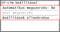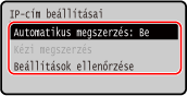 Az aktuálisan beállított IP-cím ellenőrzéseAz aktuálisan beállított IP-cím ellenőrzéséhez válassza ki a 3. lépésben látható képernyőn a [Beállítások ellenőrzése] lehetőséget, és nyomja meg az