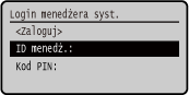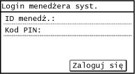 Kiedy ustawiony jest identyfikator menedżera systemu, dla operacji wymagających uprawnień administratora wyświetlany jest ekran logowania. Wprowadź identyfikator menedżera systemu i kod PIN, aby się zalogować.