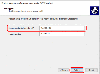 Możesz dodać ten port tylko wtedy, gdy sterownik drukarki jest zainstalowany za pomocą instalatora. Połączenie jest utrzymywane tak długo, jak długo urządzenie i komputer należą do tej samej podsieci, nawet jeśli adres IP urządzenia zostanie zmieniony.