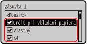 Veľkosti papiera, ktorých políčka nie sú začiarknuté, sa nezobrazia na obrazovke s nastaveniami papiera.