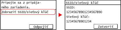 Stlačením položky [Zobraziť SSID/sieťový kľúč] skontrolujte SSID a sieťový kľúč zariadenia.
