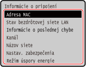 Okrem adresy MAC a informácií o pripojení k bezdrôtovej sieti LAN, keď je zariadenie pripojené k bezdrôtovej sieti LAN, môžete zobraziť aj nastavenia zabezpečenia.