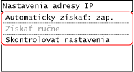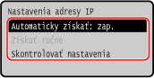 Za bežných okolností ju nastavte na [DHCP]. Ak je však [DHCP] nastavené v prostredí, v ktorom nie je možné použiť DHCP, zariadenie bude v sieti neustále potvrdzovať možnosť Automaticky získať, čím vznikne zbytočná komunikácia. Ak DHCP nepoužívate, nastavte tento parameter na [Vyp.].