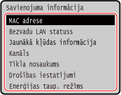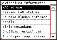 Līdz ar MAC adresi un bezvadu LAN savienojuma informāciju, kad iekārta ir pievienota bezvadu LAN, varat skatīt arī drošības iestatījumus.