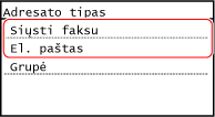Jei siunčiant faksogramą tarptautiniam adresatui įvyksta ryšio klaida, pasirinkite [Tarptautinis (1)]. Jei nepavyksta pašalinti klaidos, pasirinkite [Tarptautinis (2)] ir [Tarptautinis (3)] nurodyta tvarka.