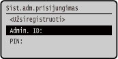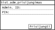 Kai nustatytas sistemos administratoriaus ID, rodomas prisijungimo ekranas su veiksmais, kuriems reikalingos administratoriaus teisės. Kad prisijungtumėte, įveskite sistemos administratoriaus ID ir PIN.