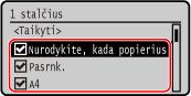 Popieriaus formatai, kurių žymės langeliai išvalyti, nerodomi popieriaus parametrų ekrane.