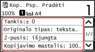 Be pagrindinių kopijavimo parametrų, aparate taip pat galima nustatyti dvipusio kopijavimo, vaizdo kokybės koregavimo ir kitus parametrus pagal originalą ir jūsų tikslą. Parametrai konfigūruojami kopijavimo ekrane.