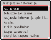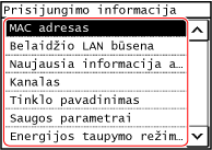 Kai aparatas prijungtas prie belaidžio LAN, be belaidžio LAN MAC adreso ir ryšio informacijos, taip pat galite peržiūrėti saugumo parametrus.