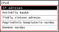 Galite peržiūrėti aparatui nustatyto IP adreso parametrus, pvz., IPv4 adresą ir IPv6 adresą.