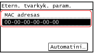 Kai aparatas prijungtas prie laidinio LAN, galite peržiūrėti aparatui nustatytą MAC adresą.