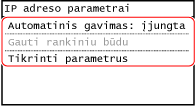 Įprastai jį reikia nustatyti į [DHCP]. Tačiau, jei [DHCP] nustatytas aplinkoje, kurioje DHCP naudoti negalima, aparatas ir toliau patvirtins „Auto Acquire“ (Automatinį gavimą) tinkle, taip kurdamas nereikalingą ryšį. Jei DHCP nenaudojamas, nustatykite į [Išjungta].