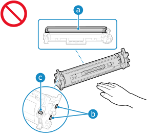 Veenduge, et hoiate toonerikassetti selle käepidemest. Ärge puudutage tooneri etteandeosa (  ), elektrikontakte (  ) ega toonerikasseti mälu (  ). |