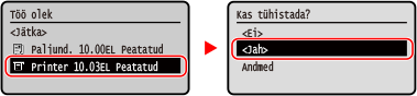 Kui kuvatakse tööde loend, valige tühistatav töö, valige [Jah] ning vajutage