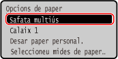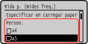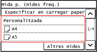 Quan es registren mides de paper no estàndard que s'utilitzen amb freqüència, la mida registrada es mostra com a mida del paper. Registre de mida de paper no estàndard (paper personalitzat)