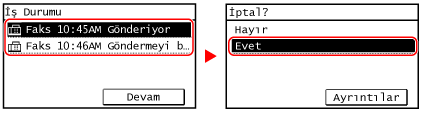 Bir iş listesi ekranı görüntülenirse iptal edilecek işi seçin ve [Evet] öğesine basın.