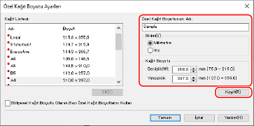 Özel kağıt boyutu adı ve kağıt boyutunu girip [Kayıt] öğesine tıklayın.