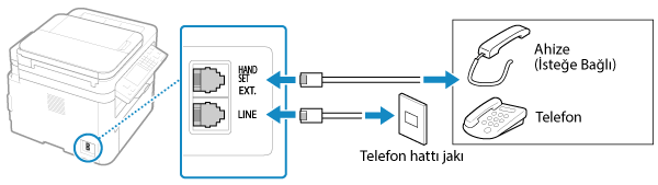 İsteğe bağlı ahizeyi veya telefonu, makinedeki ahize jakına (AHİZE) / harici telefon jakına (EXT.) bağlayın.