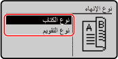 في شاشة النسخ، اضغط على [على وجهين]  [نوع المستند الأصلي/الإنهاء].