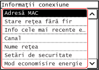În afara adresei MAC și a informațiilor de conexiune ale rețelei LAN wireless când aparatul este conectat la rețeaua LAN wireless, puteți vizualiza și setările de securitate.