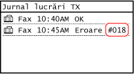 Dacă imprimarea nu se poate efectua sau datele scanate sau un fax nu pot fi trimise sau recepționate, în raport sau în jurnalul de lucrări se afișează un cod de eroare (număr de trei cifre, care începe cu „#”).