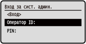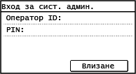 Когато е зададен ИД на системния оператор, екранът за вход се показва за операции, които изискват администраторски права. Въведете ИД и PIN на системния оператор, за да влезете.