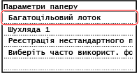 Якщо ви завжди використовуєте той самий папір у багатоцільовому лотку, можна зареєструвати його формат і тип. Екран параметрів паперу перестане відображатися, і вам не доведеться налаштовувати параметри.