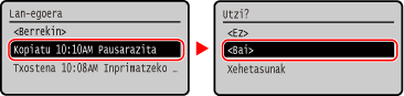 Lanen zerrendaren pantailan bistaratzen bada, hautatu ezeztatuko duzun lana eta sakatu [<Bai>] eta gero