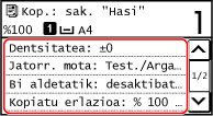 Kopiaren oinarrizko ezarpenez gain, makinak bi aldeak kopiatzeko, irudiaren kalitatea doitzeko eta originalaren eta asmoaren arabera beste ezarpen batzuk ezartzeko doikuntzak ere baditu. Erabili ezazu kopia-pantaila ezarpen horiek konfiguratzeko.