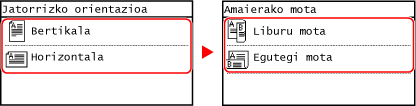 * Baliteke bi aldeetatik kopiatzeko aukera erabilgarri ez egotea hainbat paper-tamaina eta motarekin.